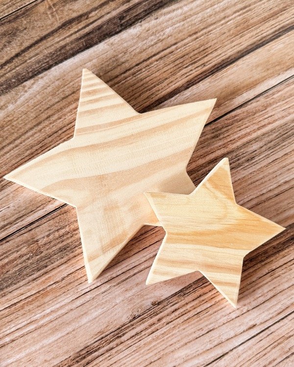 DOS ESTRELLAS DE MADERA RÚSTICA DE PINO. 13cm y 20cm. DE 15mm DE ESPESOR
